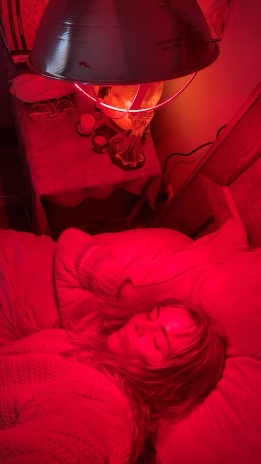 In the evening, I eat dinner and then either sauna or take a bath most nights. I turn on red lights and candles, use the vibration plate again, sometimes do myofascial release, spray myself with magnesium, and read under a chicken light before bed.