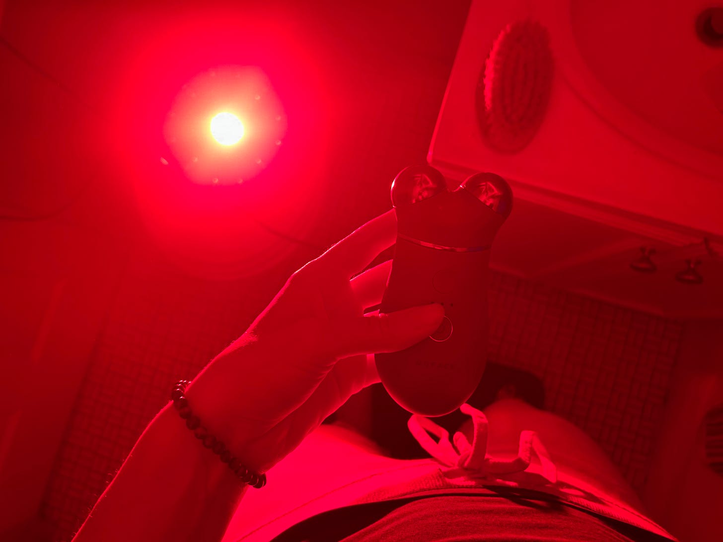 💡 Pro tip: Try to do red light in the morning, as earlier exposure is less likely to interfere with melatonin signaling later in the evening. It also pairs nicely with copper peptides, which I apply after doing the micro-current.